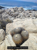 Opouštíme malebné město Caldera, kde jsme byli ubytování v příjemném hotelu. Po několika km po Ruta 5 směrem na sever odbočujeme na prašnou cestu směrem do hor. Holá planina je plná prašných cest. Snažíme se najít tu nejméně děravou bez vždy přítomných „rolet“. Konečně se přibližujeme ke kopečkům porostlých nízkými keři. Oceán je stále v dohledu, protože stále stoupáme do kopce. Zastavujeme u prvních skalek. Snažím se vylézt do prudkého svahu. Mimo sloupovitých Eulychnia spinibarbis ale nic nenalézám. Vracím se s nepořízenou k autu. A ejhle, konečně vidím malé rostlinky pod keřem a další ve skalní štěrbině! Jsou to ony! Snažím se najít další a to se dlouho nedaří. Konečně vidím další rostliny, ale ne Cop. leonensis, ale nějaký pro mne neznámý Pyrhocactus sp.. Nalézám ještě pár rostlin a to dokonce s květy.